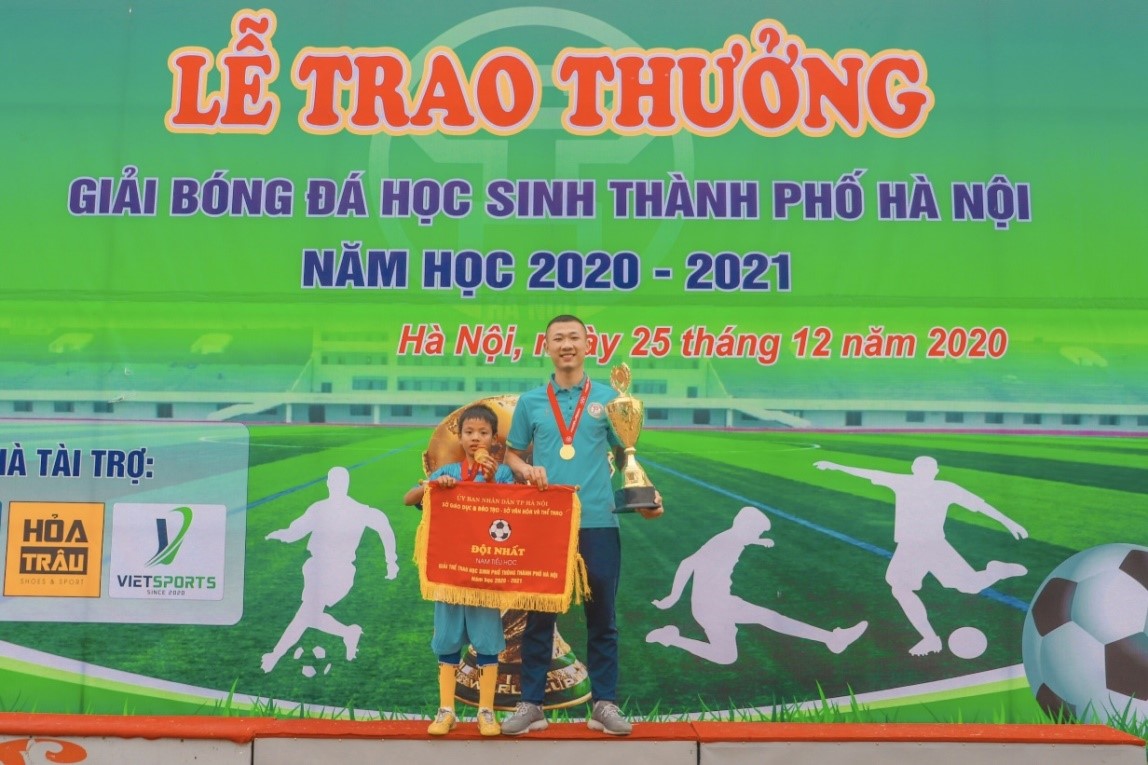 Ảnh: Thầy Nguyễn Thành Nam dẫn dắt HS Hoàng Thế Toàn và đạt Huy chương Vàng trong giải bóng đá cấp Thành phố