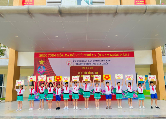 Vào sáng thứ hai ngày 19/9/2022, Liên đội trường Tiểu học Gia Quất đã tổ chức buổi lễ Chào cờ đầu tuần 3 theo chủ điểm: Chống rác thải nhựa; Phòng chống dịch sốt xuất huyết. Mở đầu là phần nghi lễ Chào cờ, bài hát Quốc ca hào hùng, nghi thức hô khẩu hiệu Đội, lời hứa thực hiện tốt “5 điều Bác Hồ dạy” và chủ đề năm học 2022 – 2023.