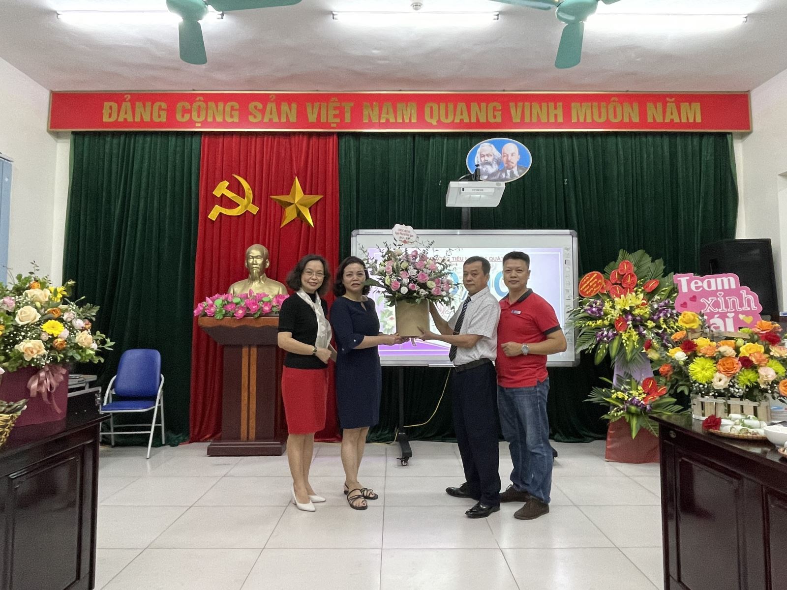 Ban giám hiệu thay mặt công đoàn viên nữ nhận lẵng hoa tươi thắm từ các nam giới trong nhà trường.