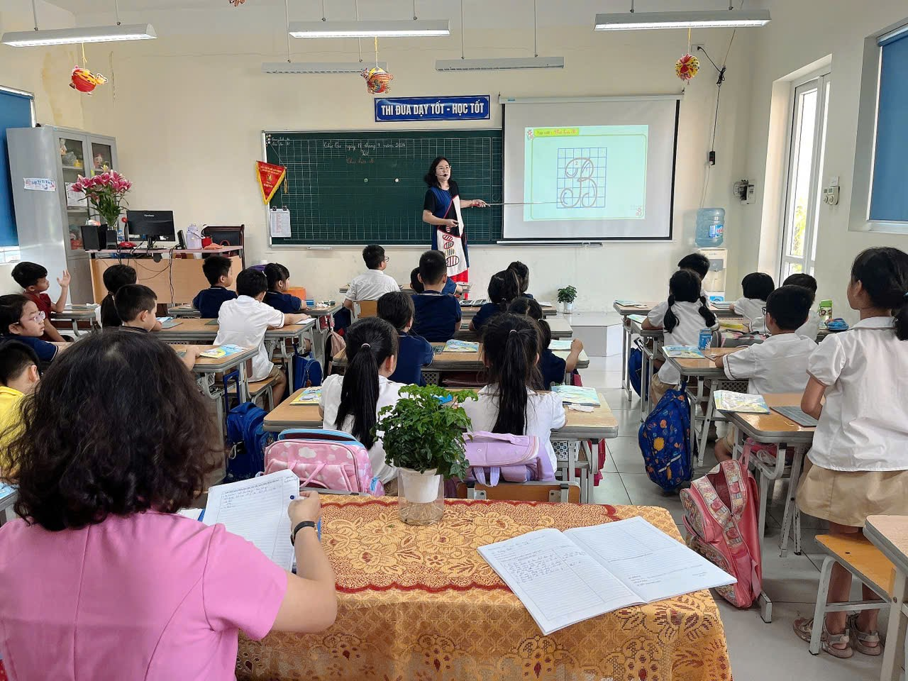 Với tầm quan trọng của việc rèn chữ cho học sinh, phân môn Tập viết ở lớp 2 được chia theo thời lượng mỗi tuần có một tiết để rèn cho các con viết đều nét, đẹp. Nhận định được tầm quan trọng của việc rèn chữ, chiều Thứ Tư ngày 18/09/2024, cô giáo Nguyễn Thanh Loan – Tổ trưởng chuyên môn tổ 2 đã thực hiện dạy một tiết chuyên đề về phân môn Tập viết để các thành viên trong tổ nắm chắc quy trình và các sửa nét cho học sinh. Trong từng suốt tiết dạy – cô giáo luôn uốn nắn tư thế ngồi, cách cầm phấn cầm bút, cách để vở và giữ khoảng cách từ vở đến mắt, nhắc nhở học sinh cách trình bày, ý thức viết chữ và giữ gìn sách vở.