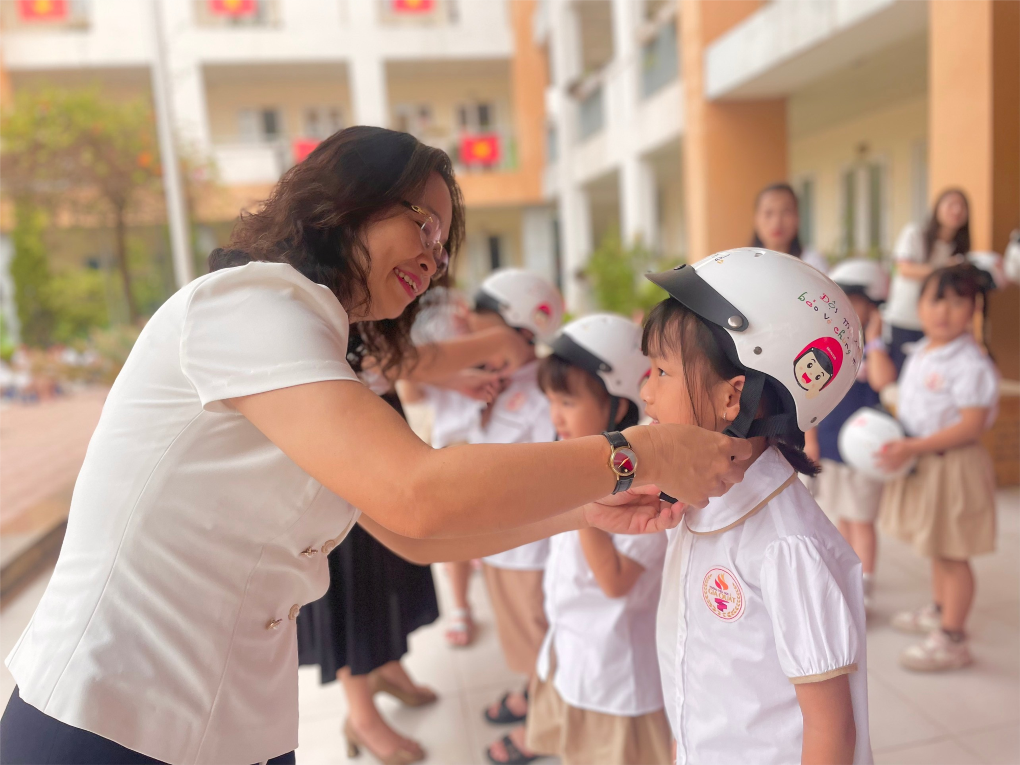 Các thầy cô trao tặng mũ bảo hiểm cho các con học sinh lớp 1
