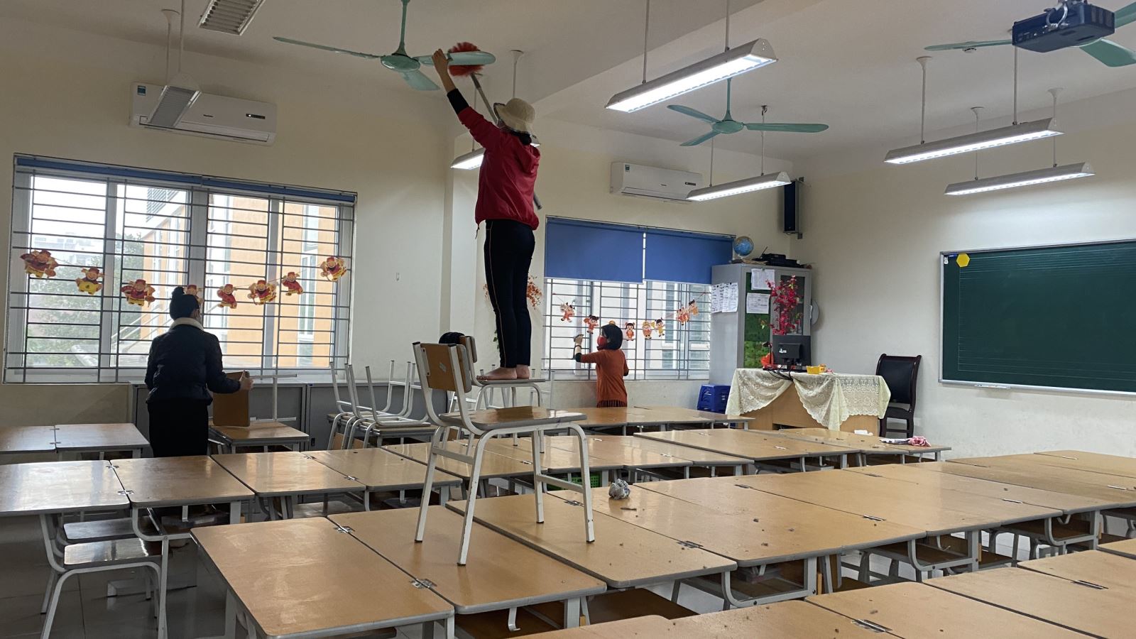 Các cô giáo lau chùi, dọn dẹp tất cả các khu vực trong trường từ khuôn viên cho đến phòng học, phòng ăn, nhà vệ sinh... Dù làm việc luôn tay nhưng ai cũng vui vẻ và phấn khởi vì ngày mai được trở lại công việc thường nhật.