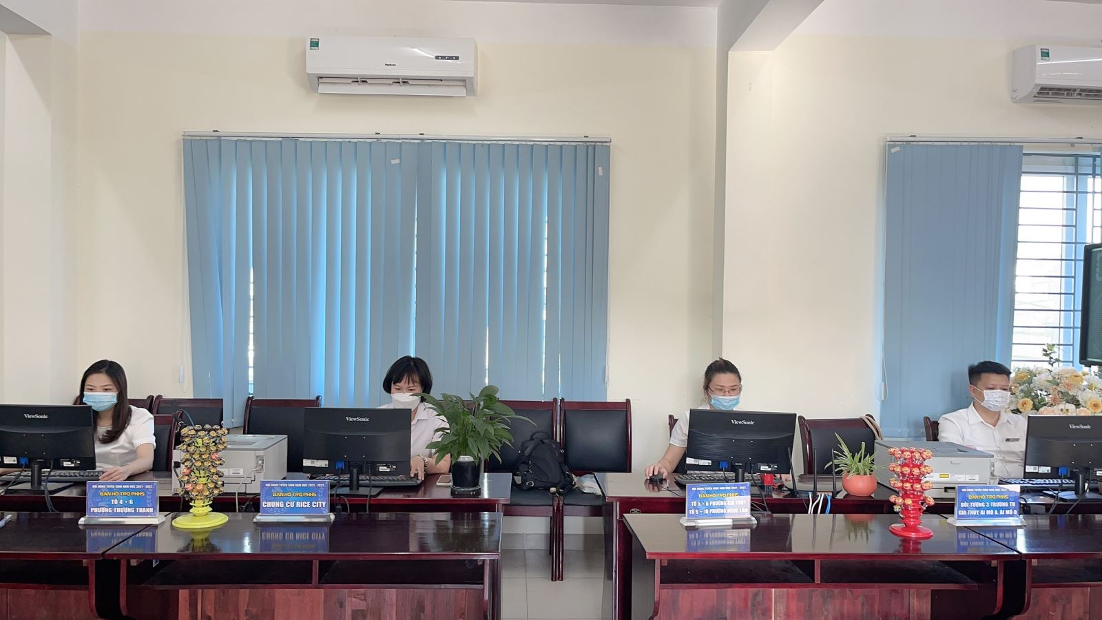 Thấu hiểu sự lo lắng của cha mẹ, ngay từ sáng 12/07/2021, đội ngũ cán bộ, giáo viên làm công tác tuyển sinh của nhà trường đã có mặt, khởi độngmùatuyểnsinh, sẵn sàng hỗ trợ Phụ huynh học sinh trong việc đăng kí trực tuyến, đồng thời giải đáp những vướng mắc, khó khăn của cha mẹ. Phòng hỗ trợ tuyển sinh trực tuyến luôn đảm bảo trật tự nề nếp và giãn cách an toàn. Các bậc CMHS được bộ phận hỗ trợ tuyển sinh hướng dẫn tận tình, chu đáo dù tuyển sinh trực tuyến tại nhà.
