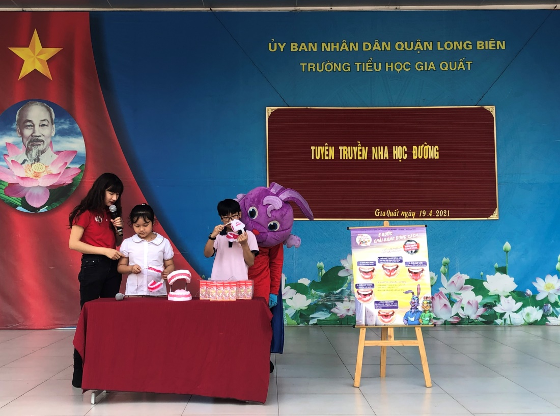 Học sinh toàn trường được tham gia chương trình cùng nhân viên công ty Colgate và bác sĩ Thỏ tổ chức cho HS tìm hiểu cấu tạo hàm răng, cách đánh răng qua nhiều hoạt động bổ ích.