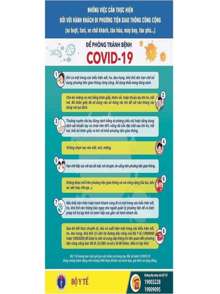 7.Nếu thấy bản thân hoặc hành khách cùng đi có một trong các biểu hiện sốt, ho, khó thở nên thông báo ngay cho người quản lý phương tiện để có biện pháp hỗ trợ kịp thời.